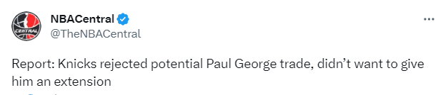 JRS直播网讯07月05日,据报道,纽约尼克斯拒绝了关于的乔治的潜在交易,他们认为交易得到乔治付出的代价太大,而且他们也不想立即和乔治续约。