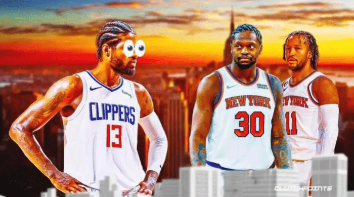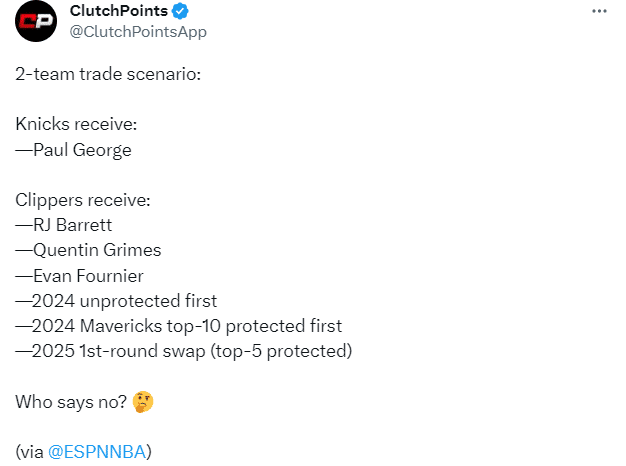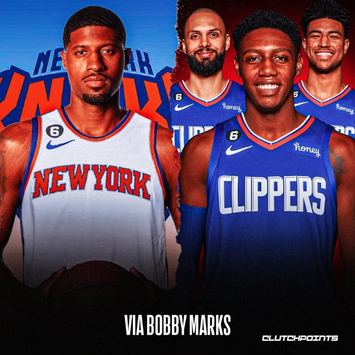 NBA薪资专家Bobby Marks曾列出尼克斯6换1的交易方案——尼克斯送走巴雷特、格雷姆斯、富尼耶、2024年不受保护首轮签和2024、2025年受保护首轮签,从快船得到乔治。