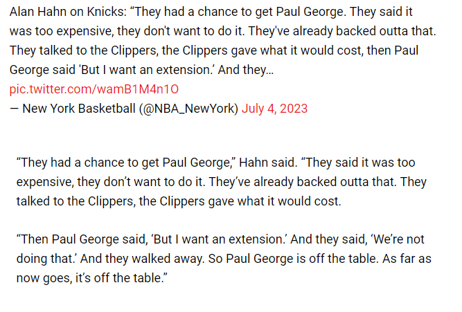 尼克斯记者Alan Hahn透露,今年休赛期尼克斯有机会得到保罗-乔治,但他们认为为乔治放弃一揽子的计划太贵了,他们不想这样做;尼克斯和快船谈判过,快船给出了要价,而且乔治表示:我想要续约,尼克斯不想和他立即续约,然后谈判就结束了,目前乔治已经不在尼克斯的考虑范围内了。
