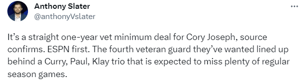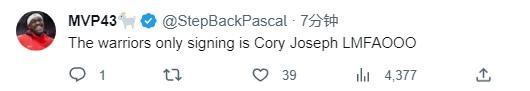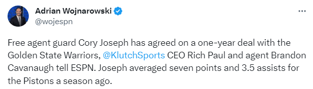 JRS直播网讯07月03日,在NBA自由球员交易市场上,勇士终于引援一名球员,据名记woj报道,知名经纪人里奇-保罗确认,科里-约瑟夫一年合同加盟勇士,新赛季约瑟夫辅佐库里冲击总冠军。