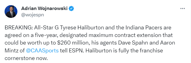 今夏哈利伯顿和步行者提前续签最高5年2.6亿美元的顶薪合同,成为今夏第一位拿到超过2亿美元的大合同,这也是哈利伯顿生涯第一份超级顶薪合同;哈利伯顿成为2013年乔治之后第二位签下制定新秀顶薪续约合同的球员。