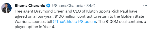 今夏格林拒绝执行最后一年2750万美元的球员选项,跳出合同成为自由球员,此前名嘴A-史密斯曾在节目中表示格林绝对值得一份1亿美元的合同,格林本人转发并且配上数钱的表情。