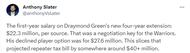 勇士记者Anthony Slater报道,格林4年1亿合同第一年薪水为2230万美元,这是勇士和他续约的关键,这使得勇士少缴纳4000多万美元的奢侈税。