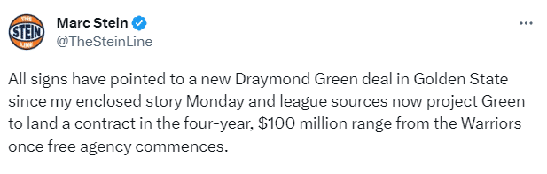 Stein报道,所有的迹象都表明德雷蒙德-格林将和勇士签下一份新约,一旦自由球员市场开启,格林将和勇士签下一份4年1亿美元的合同。