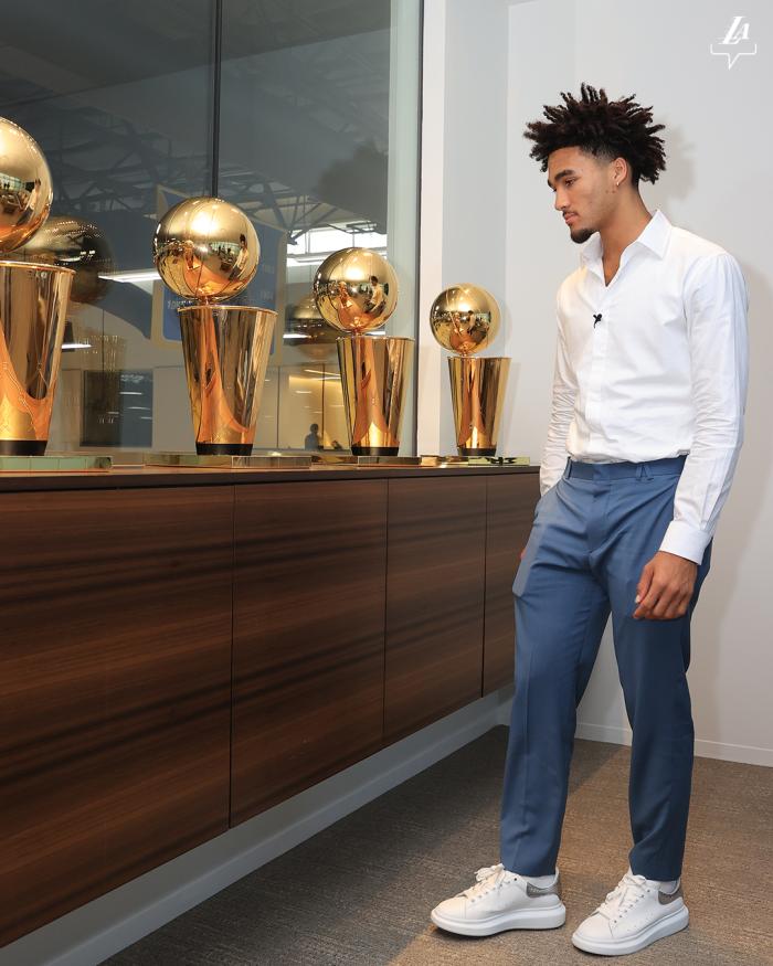 今日湖人两大新秀杰伦-胡德-席菲诺与马克斯韦尔-刘易斯正式亮相,17号秀席菲诺谈到自己出生后7天詹姆斯参加选秀,惊呼:天啊,勒布朗老了。
