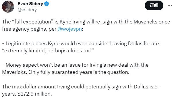 Ramona Shelburne则表示:欧文有望重返达拉斯独行侠,但他计划与其他球队会面,他想为自己余下的NBA生涯找到一个“像家一样的地方”;对于像凯里这样的人来说,这是一件有趣的事情,他成为自由球员,但他并不能真正确定达拉斯小牛队会给他五年顶薪合同(最高5年2.73亿美元)。