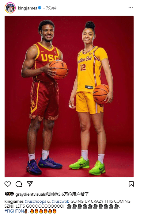 詹姆斯还转发布朗尼是身穿南加州大学球衣的定妆照,布朗尼粗壮的手臂十分抢镜;布朗尼将开启他的大学生涯,预计将参加2024年NBA选秀,ESPN预测他将在首轮被老鹰选中,看到这样的预测,老詹十分开心,转发并且高呼:詹姆斯帮来啦。