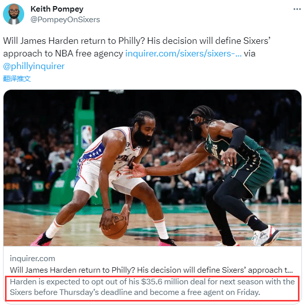 JRS直播网讯06月27日,据费城76人记者Keith Ponpey报道,哈登将会在截止日前拒绝执行下赛季价值3560万美元的球员选项,然后成为一名自由球员;新赛季哈登重返火箭还是留守费城仍是未知数,名嘴直言76人只能续约哈登,否则恩比德未来可能离队。