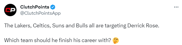 尼克斯拒绝执行球队选项,罗斯成为一名自由球员,美媒Clutch Points报道,湖人、太阳、凯尔特人和公牛有意引援他,晒出罗斯联手詹姆斯浓眉、联手杜兰特布克等球星的P照,写道:他应该在哪支球队结束自己的职业生涯?