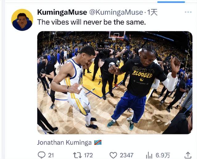 JRS直播网06月24日讯 ,在勇士和奇才的交易中,乔丹普尔作为筹码被送往奇才。此举意味着,勇士几乎必将续约追梦格林,而且决心以年龄相对较大的阵容,去冲击总冠军。而今日早些时候,勇士年轻前锋库明加在社交媒体上点赞了自己和普尔的合照,而合照的文字则是“氛围再也不会像从前一样了”。库明加此举,也直接暴露出勇士队内新老球员的关系非常不和谐,年轻的库明加,可能也会寻求离队。