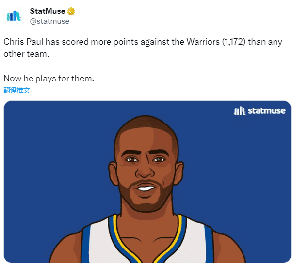 美媒StatMuse晒出了保罗的一项数据纪录:保罗生涯对阵勇士一共得到了1172分,比其对阵联盟中其他所有球队都多。