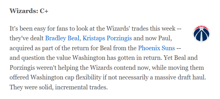 从比尔到波尔津吉斯的交易,奇才都没得到足够的回报,反倒是交易保罗,还让他们收获一个首轮。