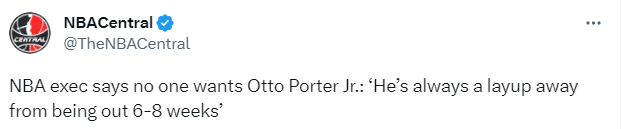 由于奥托-波特的伤病史,没有人想要在自由市场得到他;Michael Grange表示,如果有人能够接手奥托-波特630万美元的合同就太好了,但这将需要附加选秀权来说服某支球队将他带入他们的薪资空间,而波特本身的价值是负的(上赛季只打了八场比赛)