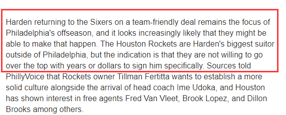 JRS直播网06月21日讯 ,今夏哈登还能签下4年超2亿美元的顶薪合同吗?据76人记者报道,哈登可能降薪留守费城,火箭也不愿意给哈登多年顶薪合同。