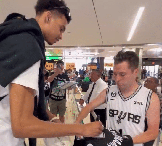 期间文班亚马在一件马刺的球衣上签名,很显然预定状元的文班亚马会在选秀大会中被马刺选中,他也被认为是NBA下一个代表性的球员,身高臂展都是联盟最顶级的存在。
