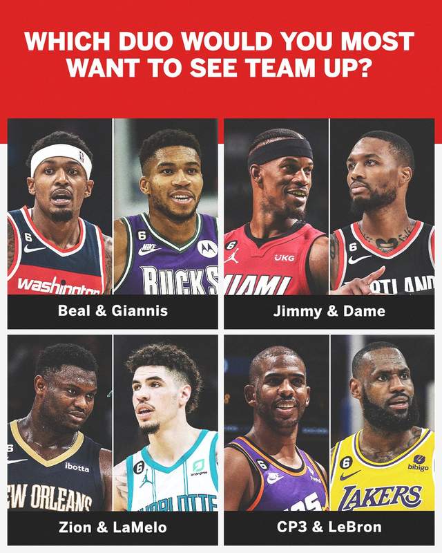 JRS直播网讯06月17日,ESPN发布了一组照片,暗示在今年夏天可能出现的4大巨星换队。他们分别是字母哥+比尔,巴特勒+利拉德,锡安+鲍尔,保罗+詹姆斯。那么这4组双巨头组合,最终是否有机会成行呢?如果最终成行,搭配效果又是如何?