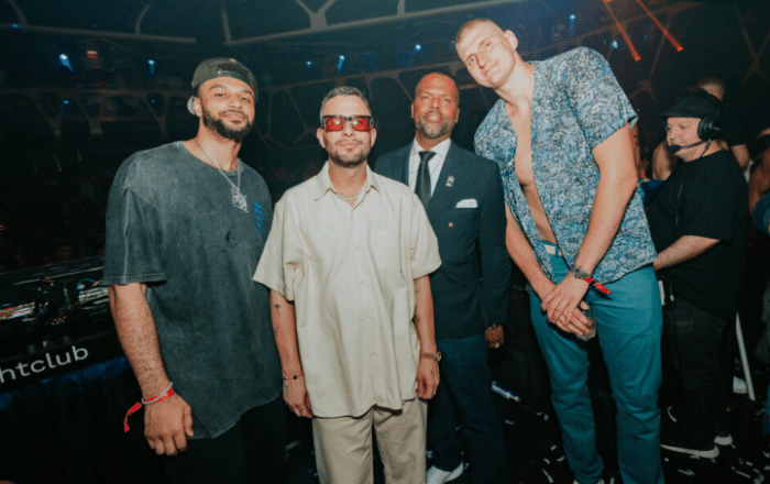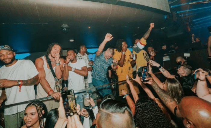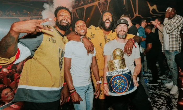 JRS直播网讯06月17日,掘金众将现身夜店狂欢庆祝夺冠,现场画面曝光,约基奇、戈登、穆雷、小布朗等人都来到赌城夜店狂欢,约基奇彻底玩嗨了;掘金悍将布朗更是喝醉了,自曝眼部伤得很重,直播责怪约基奇把他灌醉了。