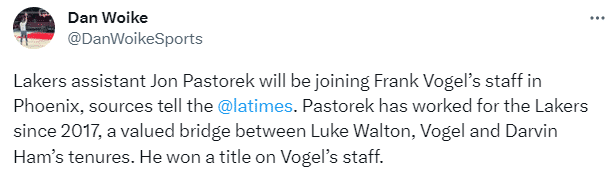 JRS直播网讯06月17日湖人队今夏离队第一人来了,据《洛杉矶时报》湖人记者Dan Woike报道,数位消息人士透露,湖人助教乔恩-帕斯托雷克将加入沃格尔在太阳的教练组。