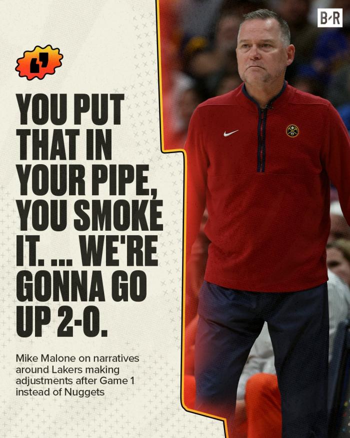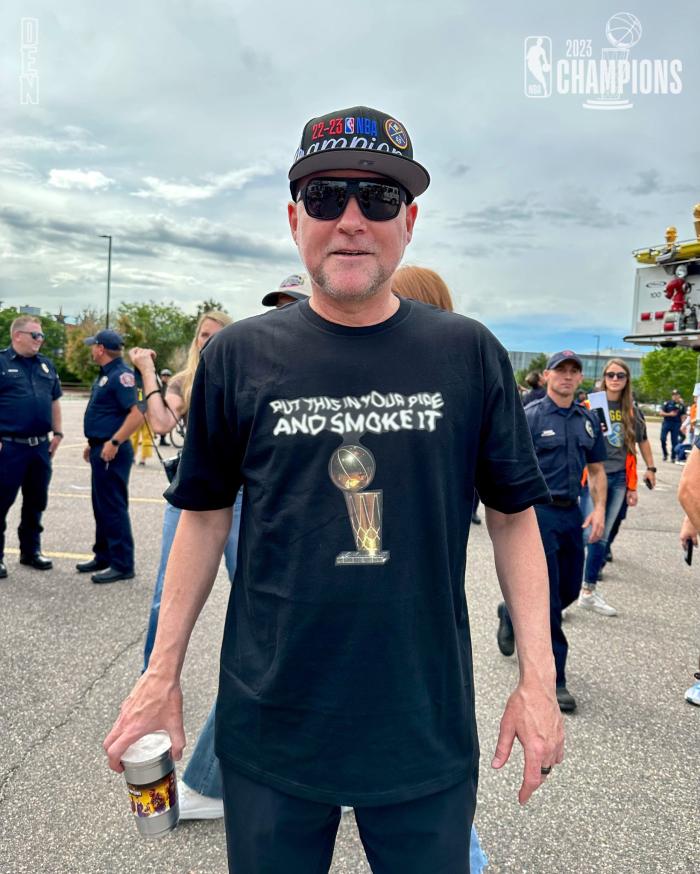 马龙戴着墨镜、身穿印有“you put that in your pipe you smoke it”和总冠军奖杯的定制T恤,这句话都马龙在掘金西决1-0领先湖人之后说的;在掘金夺冠游行庆典期间,马龙接受采访时表示:我们在庆祝夺冠,但我们的故事还没结束。我们是贪婪的混蛋,宝贝儿。我们会再夺一冠的。不过我不干了。