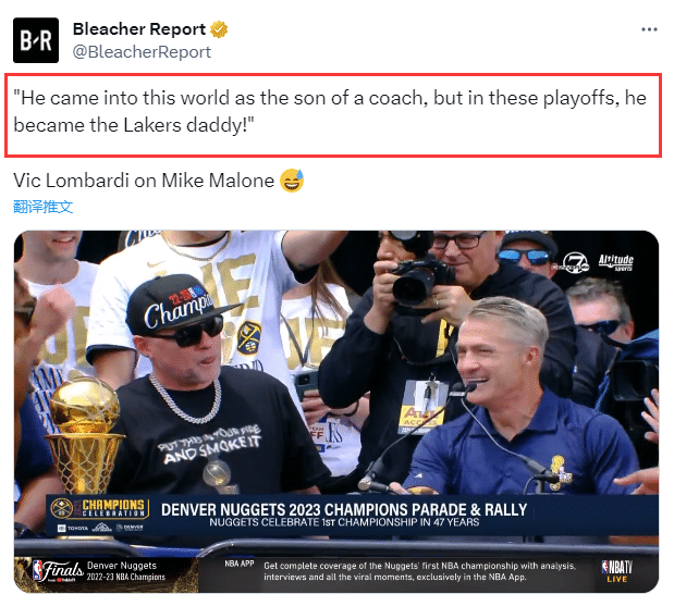 丹佛播音员Vic Lombardi在夺冠庆典上狂赞马龙,他表示:他来到这个世界上时,是一位教练的儿子,但在这些季后赛中,他成为了湖人队的爸爸。