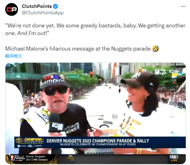 52岁的迈克-马龙玩嗨了,走下大巴后迈着六亲不认的步伐,打开香槟然后冲着现场的球迷狂喷香槟;掘金全队都在享受着胜利的喜悦,约基奇和穆雷戴着奖杯站在大巴的前面,波普狂饮啤酒,布劳恩复刻库里的晚安安庆祝动作,丹佛整座城市都嗨起来了。