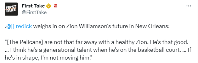 前NBA球员雷迪克表示:鹈鹕离健康的锡安并不远。他很好,我认为他在篮球场上是一代天才,如果他身体健康,我不会动他。