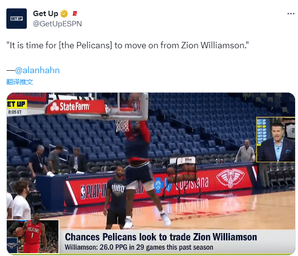 对于锡安的情况,纽约记者Alan Hahn直言鹈鹕是时候交易锡安了。