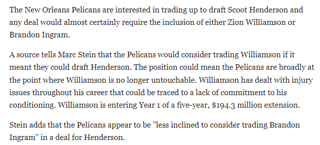 名记Marc Stein报道,如果能得到亨德森,鹈鹕确实会考虑交易锡安,但不会考虑交易英格拉姆。这表明球队内部对锡安持续的出勤率问题和其他问题的愤怒程度正在上升。