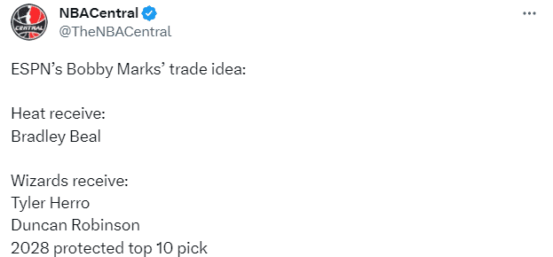 薪资专家Bobby Marks晒出热火3换1交易得到比尔的方案——热火送走希罗+邓肯-罗宾逊+2028年前10保护选秀权,从奇才得到比尔。