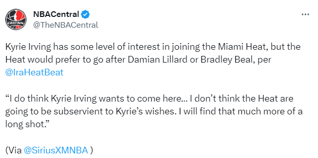 据此前名记shams报道,热火今夏将会追求球星,从而减轻巴特勒和阿德巴约身上的负担,热火曾在今年交易截止日前向篮网报价欧文,可最终热火抢人失败,最终欧文被交易到独行侠。
