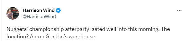 JRS直播网06月14日,据掘金记者Harrison Wind报道,掘金夺冠后全队通宵庆祝,狂欢派对一直持续到今天早上,他们在戈登的仓库中彻夜庆祝。另外掘金队将在2天后凌晨举行夺冠游行典礼。