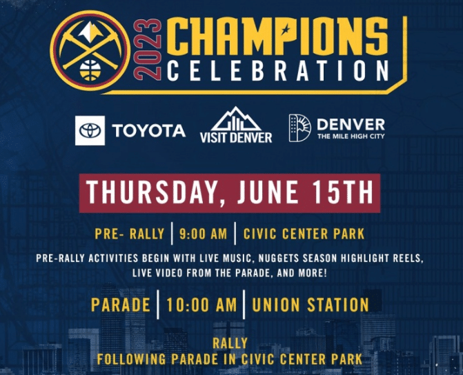 掘金夺冠之后,球队已经宣布,将会在当地时间6月15日上午10点,北京时间6月16日凌晨0点举办冠军游行,地点是丹佛联合车站。可想而知,届时将会有大量的球迷涌入掘金的夺冠游行中,庆祝队史上首个NBA总冠军的荣誉。