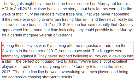 据名记Zach Lowe报道,掘金2017年曾坚定的拒绝过骑士方面关于穆雷换欧文的提议——如果他们曾有过交易穆雷的想法——事实上他们从没有过——那么交易会发生在2017年或者2018年。”Zach Lowe在其文章中写道。“掘金主帅迈克-马龙最近曾说过,那两年球队总经理康奈利曾找过他,暗示他球队可能交易穆雷去换老将。消息人士透露,2017年出现的一个提议是穆雷换欧文,当时欧文向骑士提出了交易申请,但掘金坚定的拒绝了这个提议。