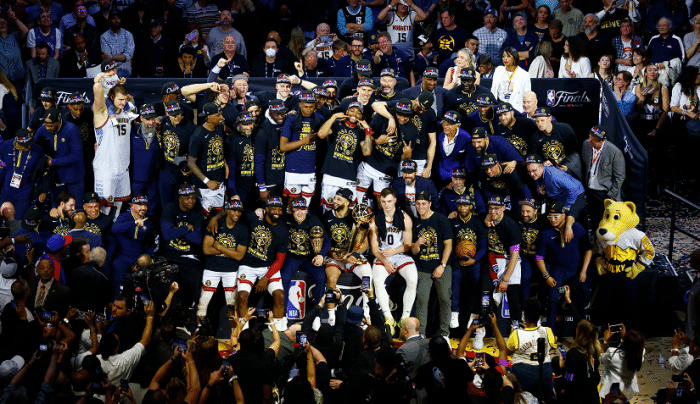 JRS直播网06月13日NBA总决赛落下帷幕,掘金在G5主场逆转击败热火,大比分4-1拿下队史首座NBA总冠军奖杯。掘金建队47年后夺队史首冠,成目前用时最长的总冠军球队,非常不容易,约基奇首度率队打进总决赛就夺冠,表现强势,他个人以全票的成绩斩获FMVP,实至名归。马龙在颁奖仪式期间表示不满足这一个总冠军,豪气冲天。掘金夺冠,更衣室成为欢乐的海洋。