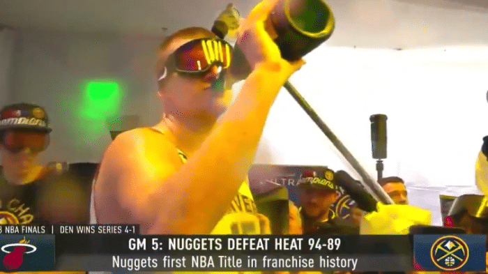 回到更衣室,掘金全队疯狂泼洒香槟以及狂抽雪茄庆祝,这就是总冠军的标配,约基奇戴着眼镜直接对瓶吹,掘金更衣室狂欢派对来了,掘金众将尽享夺冠的喜悦之中。