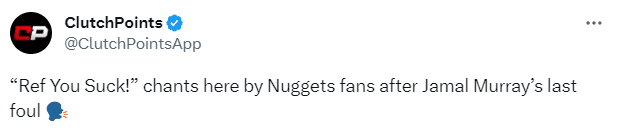 第二节,穆雷防守巴特勒,干净切球却被吹犯规,穆雷摊手十分不满,马龙站在场边也是一脸不满,掘金球迷更是爆粗口怒骂裁判垃圾。