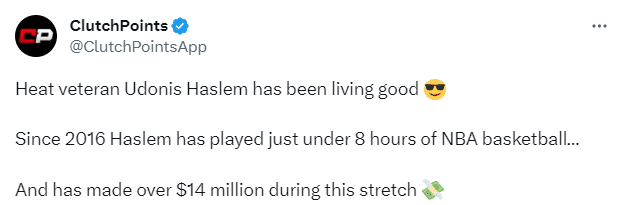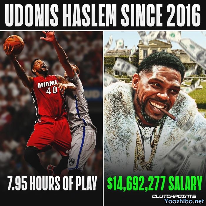 JRS直播网06月12日美媒晒出热火43岁老将哈斯勒姆近年来的收入情况,7年出战不到8小时狂赚1400万美元,美媒Clutch Points配文写道:热火老将哈斯勒姆一直活得很滋润,自2016年以来,哈斯勒姆的NBA出场时间不足8小时,期间他挣得了超过1400万美元的薪水。
