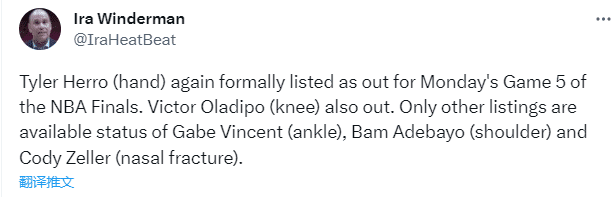 JRS直播网06月12日,热火官方公布总决赛G5伤情,希罗(手部骨折)和奥拉迪波(膝伤)都因伤缺席生死战,文森特(脚踝)、阿德巴约(肩膀)和泽勒(鼻骨骨折)都可以出战;预计掘金全队都可以出战,约基奇的脚踝伤势无大碍,穆雷(手掌擦伤)则继续带伤出战。