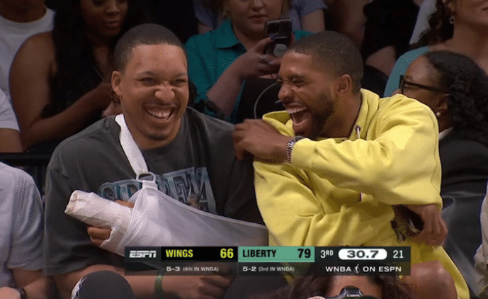 JRS直播网06月12日,绿军悍将格兰特-威廉姆斯术后亮相,并且和篮网新核布里奇斯一起观看WNBA,两人坐在一起都开怀大笑;其中格威在街头接受采访时,居然嘲讽热火马上就要被掘金淘汰了。