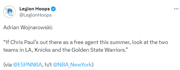 ESPN名记woj在节目中表示:如果今年夏天保罗成为自由球员的话,;洛杉矶的两支球队快船和湖人,还有纽约尼克斯或者金州勇士,这些都是保罗的潜在下家,如果他在6月29日的最后期限过后还在太阳的话,他将以比3000万美元低得多的价格续签一份数年合同。