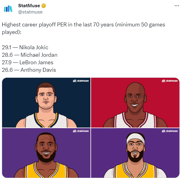 据美媒StatMuse统计,约基奇季后赛生涯至今球员效率值(PER)达到29.1,力压乔丹和詹姆斯,过去70年排名第一(至少出战50场季后赛):1、约基奇 29.1;2、乔丹 28.6;3、詹姆斯 27.9;4、浓眉 26.6。