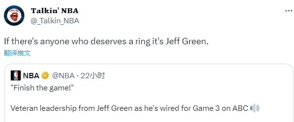 NBA官方晒出格林提醒队友别松懈的一幕,美媒转发并且配文写道:杰夫-格林值得一枚总冠军戒指。
