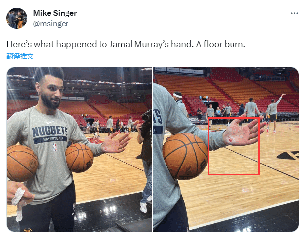 总决赛G3,约基奇轰下32分21篮板10助攻的超级三双,穆雷也轰下30+三双,掘金双星带队攻陷客场并且夺回主场优势,不过在今天的训练中,穆雷不幸遭遇伤病,据掘金记者Mike Singer报道,穆雷的左手掌破了,掉了一大块皮,所幸伤势无大碍,缠上绑带后可以继续打球。