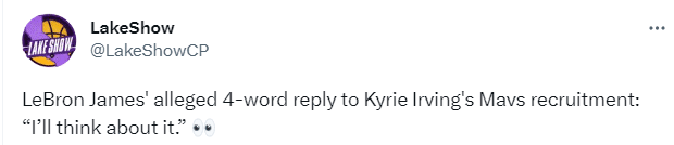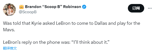JRS直播网讯06月08日近日欧文招募詹姆斯加盟独行侠的重磅消息引发巨大热议,究竟当时詹姆斯是如何回应欧文的?NBA名记布兰登-罗宾逊爆料,当欧文招募詹姆斯前往独行侠打球时,詹姆斯在电话里回应:我会考虑的(I’ll think about it)。