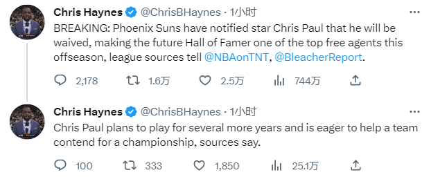 JRS直播网讯06月08日,名记Chris Haynes报道,太阳将裁掉克里斯-保罗并且已经通知后者,保罗计划再打几年,并渴望帮助球队争夺总冠军;shams报道,太阳和保罗将探讨各种选择,woj报道预计太阳将分期支付保罗的合同,后者仍想留在太阳联手杜兰特和布克。