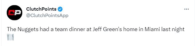 JRS直播网06月07日掘金和热火总决赛G3将在明天正式开打,除了备战之外,据美媒报道,掘金全队在迈阿密进行了一次聚餐,他们在杰夫-格林的家中聚餐,掘金36岁老将宴请全队,今年有望比哈登、威少等前队友率先夺得生涯首冠。