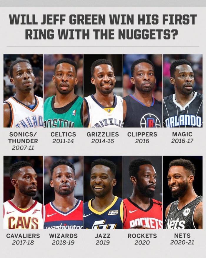 职业生涯至今,36岁格林16年已经换了11支球队,先后为雷霆、凯尔特人、灰熊、快船、魔术、骑士、奇才、爵士、火箭、篮网和掘金效力。