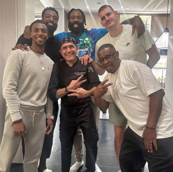 掘金全队在杰夫-格林的迈阿密家中聚餐,美媒Clutch Points晒出掘金众人合影,杰夫-格林、约基奇、小乔丹和晚餐名厨一起合影,格林还和小布朗、穆雷、主帅马龙等人合影,全队开心共进晚餐,进一步打造球队的凝聚力。