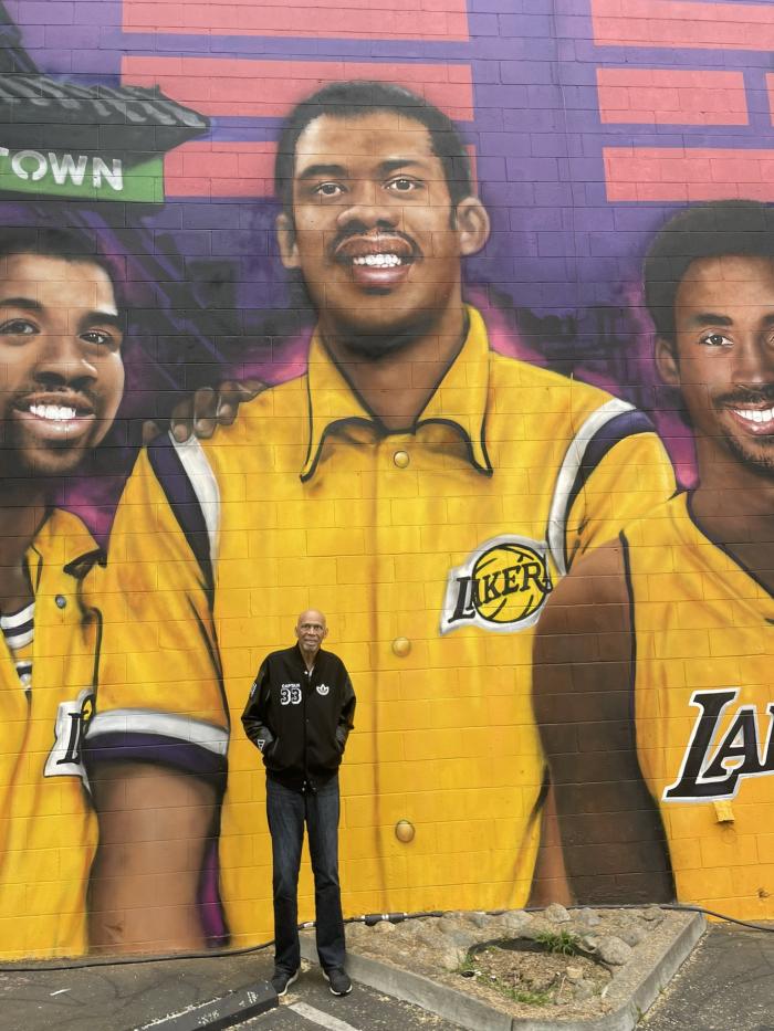 湖人名宿贾巴尔参加了洛杉矶Koreatown的湖人新壁画的揭幕仪式,贾巴尔在现场打趣道:他们也没说我今天还得发言啊;能看到这幅壁画真的很棒,很棒的画;但是,看到画了有两个科比,而我和魔术师只能在边上,我有点妒忌。
