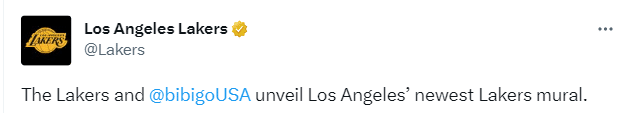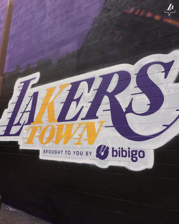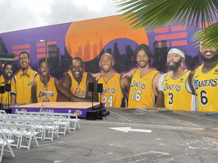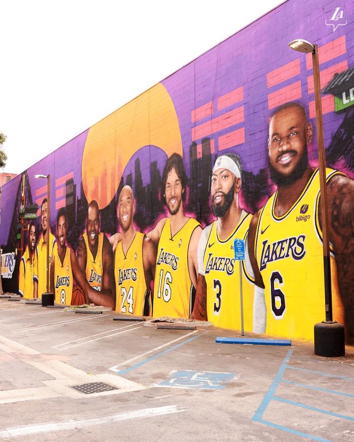 在湖人新的巨幅壁画上,詹姆斯(6号)、浓眉(3号)、加索尔(16号)、科比(24号)、奥尼尔(34号)、科比(8号)、贾巴尔和魔术师约翰逊;科比位居C位并且独占两个位置。